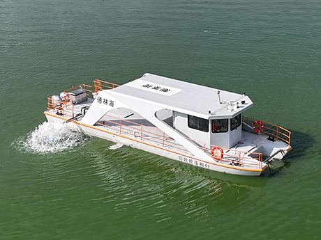 公司研發(fā)的加壓控藻船,以玻璃鋼船體為平臺(tái),配置藍(lán)藻打撈、壓力控藻和曝氣裝置...